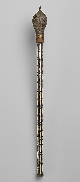 Solomon Islands is home to a huge diversity of adornments and ceremonial weapons designed to communicate the status and prowess of their bearers. Ceremonial batons from Malaita, known as wari hau (literally, round stone) for the shape of their heads, were carved from iron pyrite and completed with a finely woven covering for the head of the baton and nautilus shell inlay on the handle.