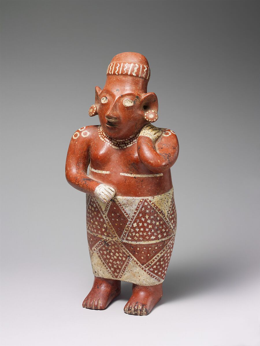 Few textiles from ancient Mesoamerica have survived, but artworks like this one provide valuable insights into their use and appearance. West Mexico’s weavers utilized various structural techniques on and off the loom, including hand netting, to create designs that reflect the geometry of the weaving process itself. This can be seen in the diamond-like patterning of the skirt. Using only white and red slip the artist suggests the various textures of the woven cloth depicted. Cloth colored with dyes sourced from plants, insects, and minerals was manipulated in myriad ways to create items of dress and ornament. Textiles were wrapped around the lower body to form loincloths and skirts, and narrow, twisted bands of cloth were wound and tied to secure head coverings. Even neck ornaments were sometimes delicately woven and beaded.