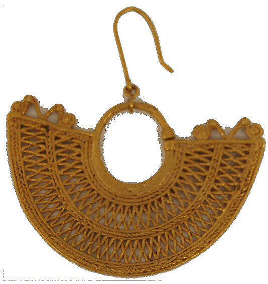 This pair of ear ornaments is an example of one of the hallmark forms of the metalwork produced by the Zenú people who lived and currently live in the Caribbean Lowlands of Colombia. The ornaments have a cast filigree design. In other words, they have the appearance of wirework but, instead of actually shaping metal wire into the form, the artists created the wire design by casting it, in this case, through the lost wax process (please see below for further detail). Each ornament was cast as one piece, except for the wire attachments on each, which were added recently. While these ornaments are examples of cast filigree, in recent centuries, people in Mompox, in the Zenú region, have been practicing filigree, using wire rather than casting metal. Today, they work typically in silver, and people’s memories point to early Zenú and Spanish Colonial-period metalworking traditions as origins of their practice (Lobo 2014).