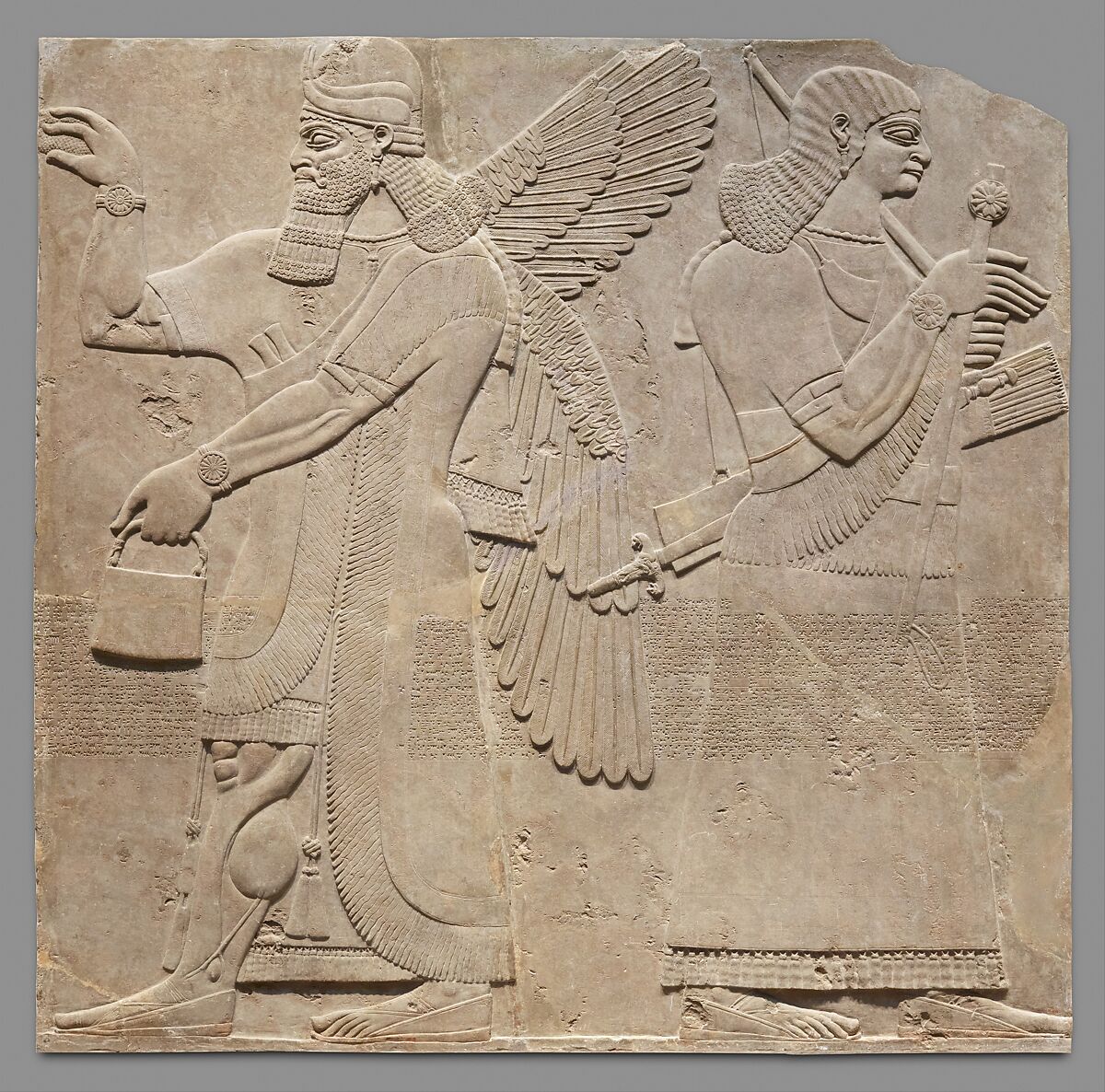 This relief, from the palace of the Assyrian king Ashurnasirpal II (r. ca. 883-859 B.C.), depicts a supernatural protective figure and a mortal Assyrian courtier. The two larger-than-life-sized figures are carved in low relief. This panel joins a second relief (32.143.4, see ‘Additional Images’ above) that shows the king and a second courtier. Together, the two panels show the king flanked by his human courtiers. The winged figure here formed part of a similar neighboring scene, this time with the king flanked by divine protectors.
