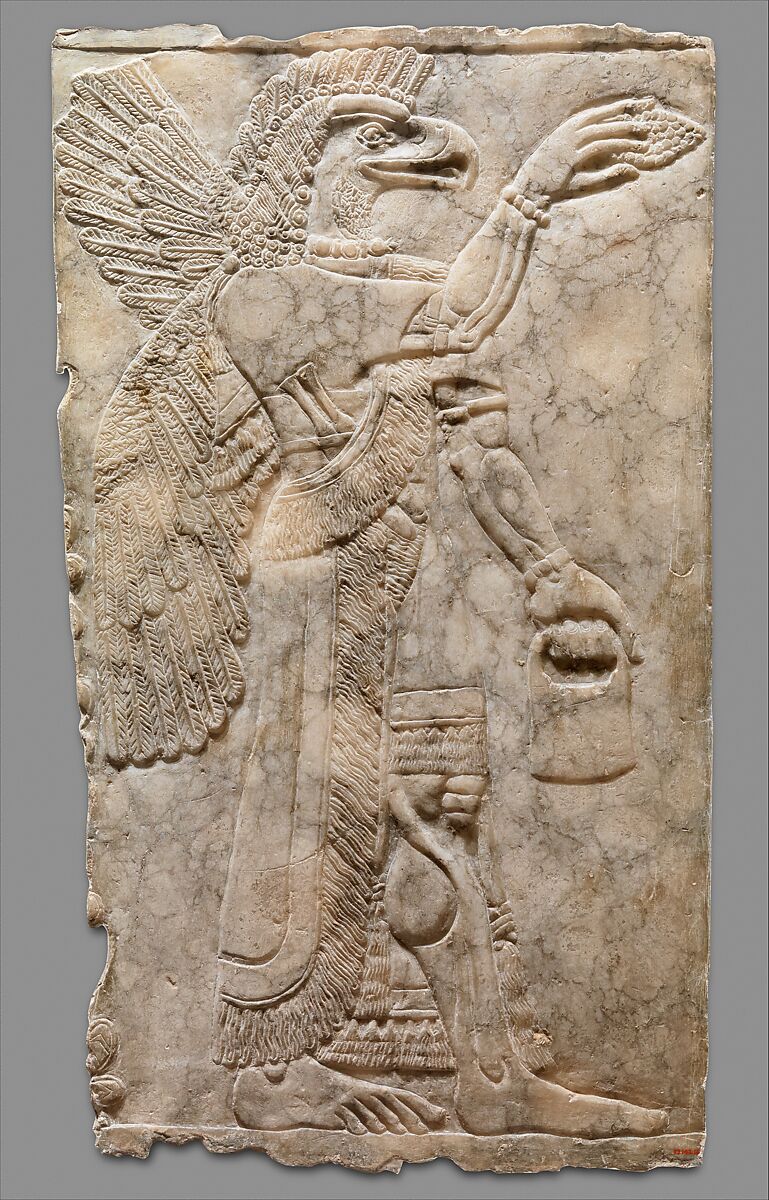 The figure depicted on the panel is eagle-headed and faces right, holding in his left hand a bucket and in his right hand a cone whose exact nature is unclear. One suggestion has been that the gesture, sometimes performed by figures flanking a sacred tree, is symbolic of fertilization: the "cone" resembles the male date spathe used by Mesopotamian farmers, with water, to artificially fertilize female date-palm trees. It does seem likely that the cone was supposed to hold and dispense water from the bucket in this way, but it is described in Akkadian as a "purifier," and the fact that figures performing this gesture are also shown flanking the king suggests that some purifying or protective meaning is present. The figure is richly dressed, with jewelry including a collar whose front bead appears pomegranate-shaped, a further collar with pendant tassels, armlets, and bracelets. Although we cannot know how these elements were originally painted, excavated parallels include elaborate jewelry in gold, inlaid with semi-precious stones. The figure carries two knives, tucked into a belt with their handles visible at chest level.