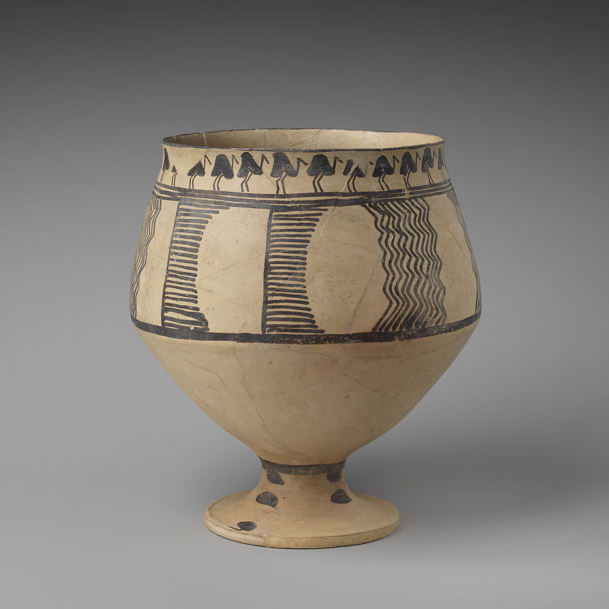 This goblet comes from a site near Kashan called Tepe Sialk. Excavations conducted at the site in 1933, 1934, and 1937 uncovered large amounts of prehistoric pottery which have provided important evidence for the early chronology of the central Iranian plateau. Like much of the pottery from Iran in the Chalcolithic Period (ca. 5500-3000 B.C.), this piece is very skillfully made, with thin walls and a crisply formed, symmetrical profile. It was likely created or finished using a tournette, the precursor to the potter’s wheel, which is a flat disc balanced on a central pivot that can be spun with one hand while the other hand is used to smooth and shape a pot in the center of the wheel. The designs painted in dark brown against the buff-colored ceramic work in harmony with the shape of the goblet. Large, widely spaced dotted lines fan out vertically across the foot, below a horizontal band. Another thick band encircles the widest point of the vessel, above which rows of comb-like horizontal lines or wavy vertical lines rise to cover the outside surface, topped by three narrower bands above which a row of bent-legged waterbirds proceeds in single file to the right, filling the space of the slightly flaring lip. The combination of stylized animals, especially birds and ibexes, with geometric patterns is typical of the fine pottery from this period at Tepe Sialk. This vessel was probably used for drinking, and the elaborate decoration brings into question whether it was intended to serve as utilitarian tableware, or for use on special occasions including rituals.