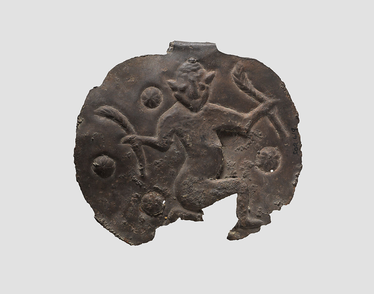 This thin bronze sheet features a male figure in repousse facing forward. He has bulging eyes, pointed ears and a beard. No other details of his body are shown. One attenuated leg with bent knee is depicted; it is unclear whether the figure is meant to be seated or kneeling, since the bottom of the sheet is missing. The figure holds palm fronds in each hand. There are rosettes (or some other floral element) in the background. There is a rolled loop at the top of the sheet, indicating that it is a pendant.