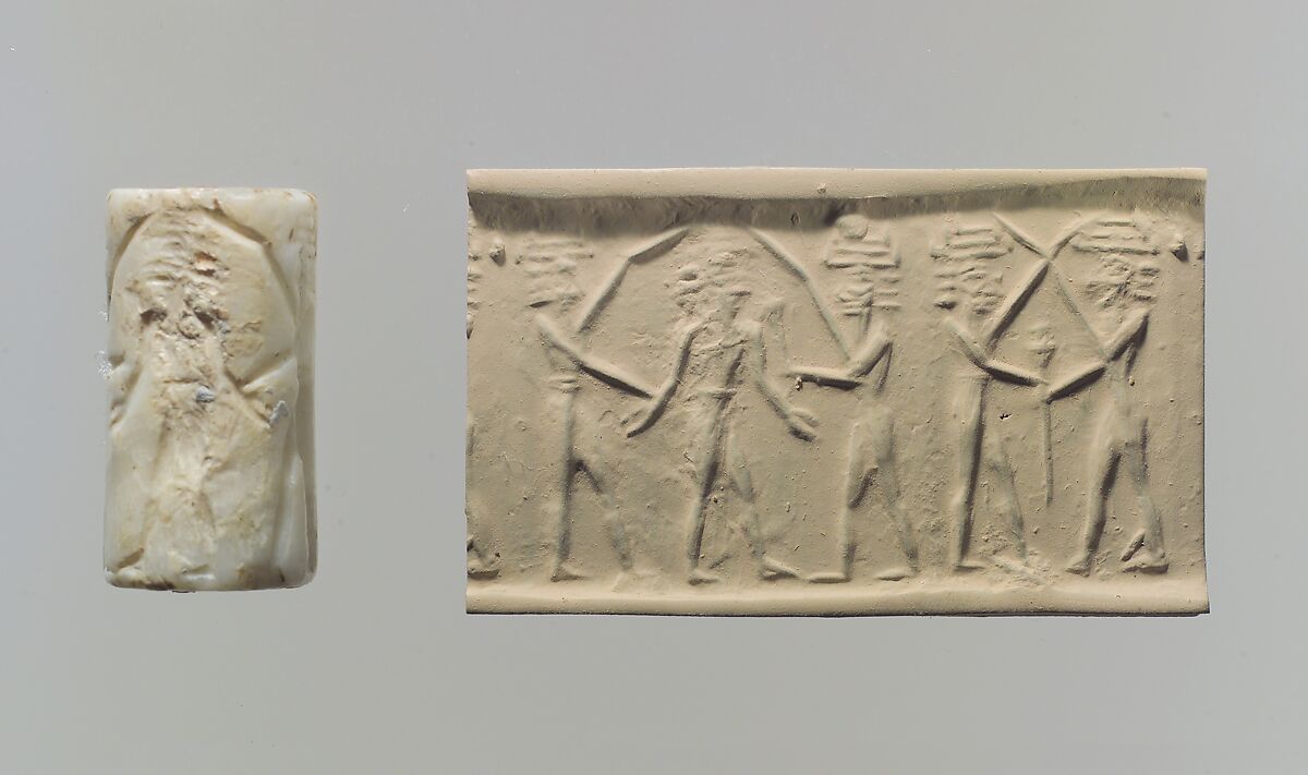 The modern impression of the seal is shown so that the entire design can be seen. This seal shows two groups of battling gods, all wearing horned headdresses (visible as horizontal lines with vertical projections at the ends). One group consists of two deities flanking a third, holding his arms down with palms up. Both attacking gods grasp the central deity's headdress, while the god to the right smites him with a mace. In the second group, two deities grasp the same mace and the top of each other's headdress.