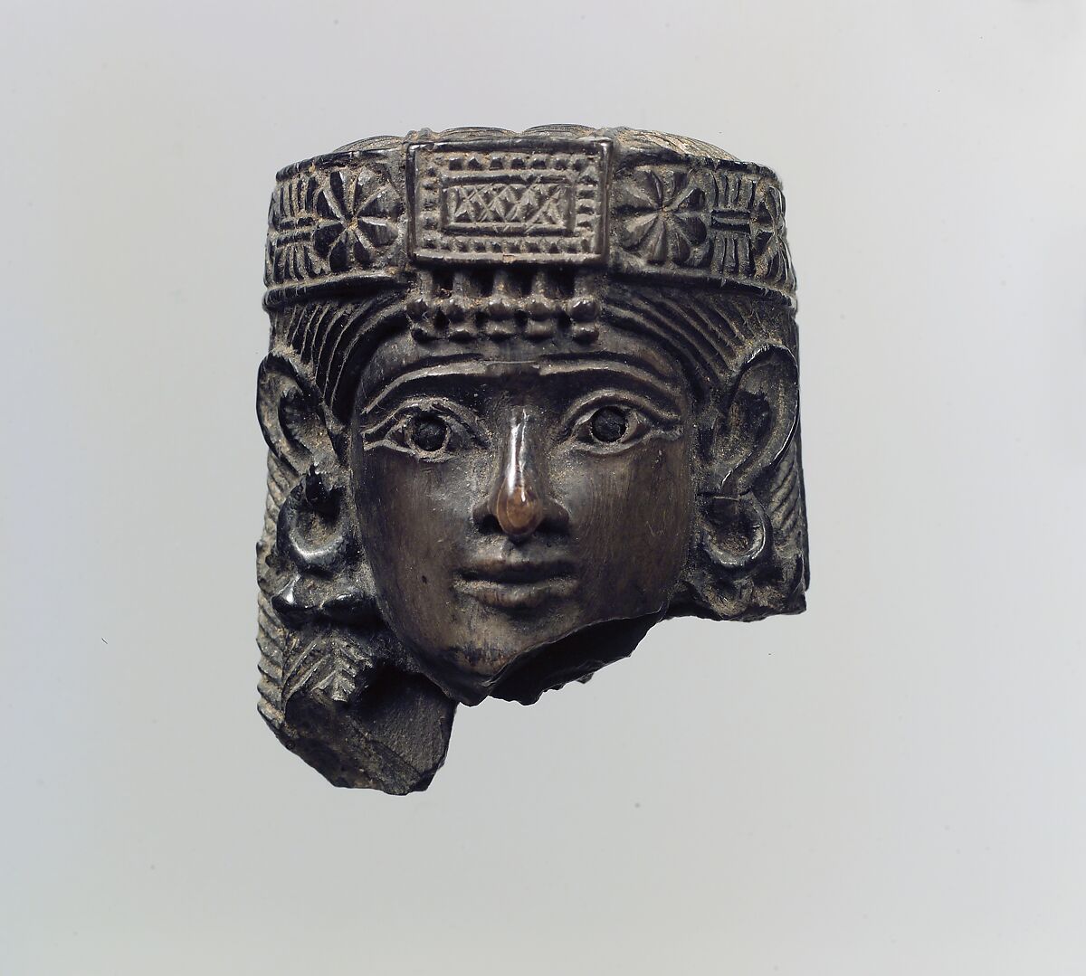 Carved in the round, this female head was found in the Burnt Palace at Nimrud and was blackened through exposure to fire during the final defeat of Assyria at the end of the seventh century B.C. Originally, it may have been part of a composite statuette made of various materials and overlaid with gold. The fleshy cheeks, full lips, and small, receding chin are combined with stylized features such as the eyebrows and eyes, all characteristic of Syrian style ivories. The pupils are drilled to receive inlays in colored glass or semiprecious stones. The hair, tucked behind the ears, falls in braids. Like other carved ivory female figures from the Neo-Assyrian period in the Metropolitan Museum’s collection (MMA 57.80.11, 57.80.12, 57.80.13, and 61.197.5), this figure is richly adorned with jewelry, including hoop earrings with pendants, and a woven diadem, studded with rosettes and a rectangular forehead ornament with pendant pomegranates. A diadem closely resembling the one depicted here, made of gold and inlaid with lapis lazuli and colored stones, was found in the grave of a royal woman at Nimrud.