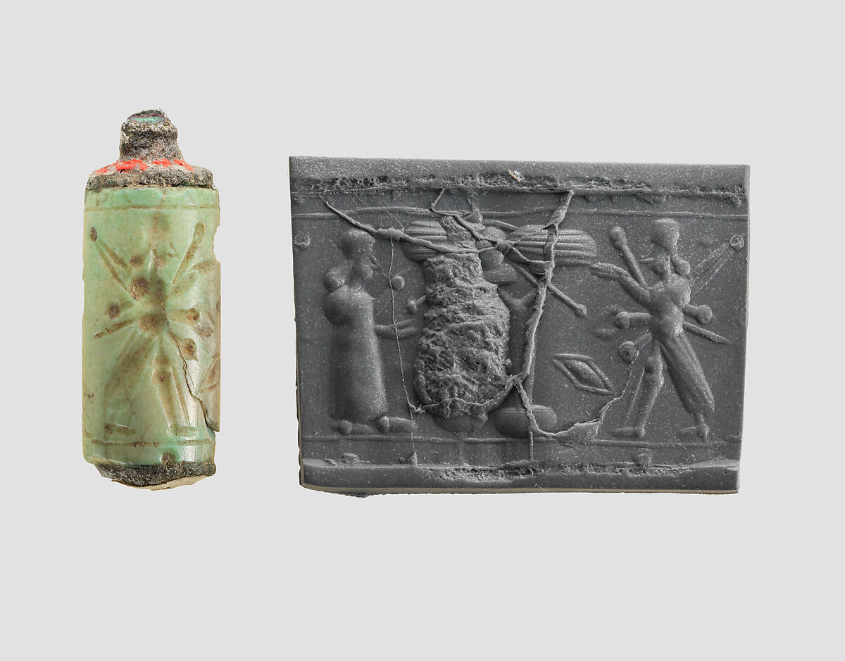- Title: Cylinder seal (with caps preserved) with cultic scene
