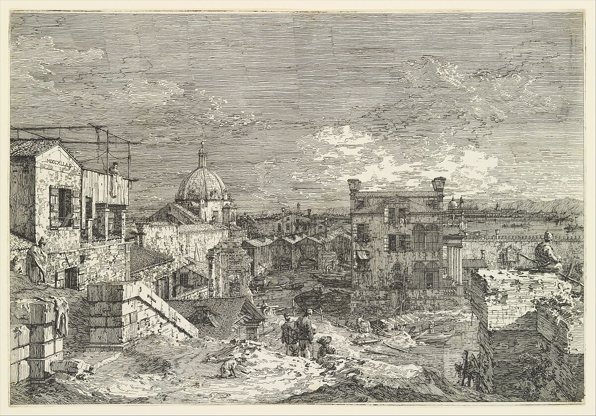 Venice in the eighteenth century was the site of an extraordinary flourishing of print production, which reached its apogee in the years 1740–45. It was in these years that Canaletto, the great painter of views of Venice and also of England during his sojourn there, made approximately thirty etchings: thirteen large plates and seventeen smaller ones. The title plate to the series states that these are 'Views, some representing actual sites, others imaginary.' This is one of the imaginary views, reminiscent of Venice and the lagoon. For an unknown reason, Canaletto divided this plate down the middle, between the backs of the two central figures, soon after it was made. Fewer than ten impressions are known from the undivided plate. The date, 1741 in Roman numerals on the wall at the left, is the only one on any of Canaletto's prints.