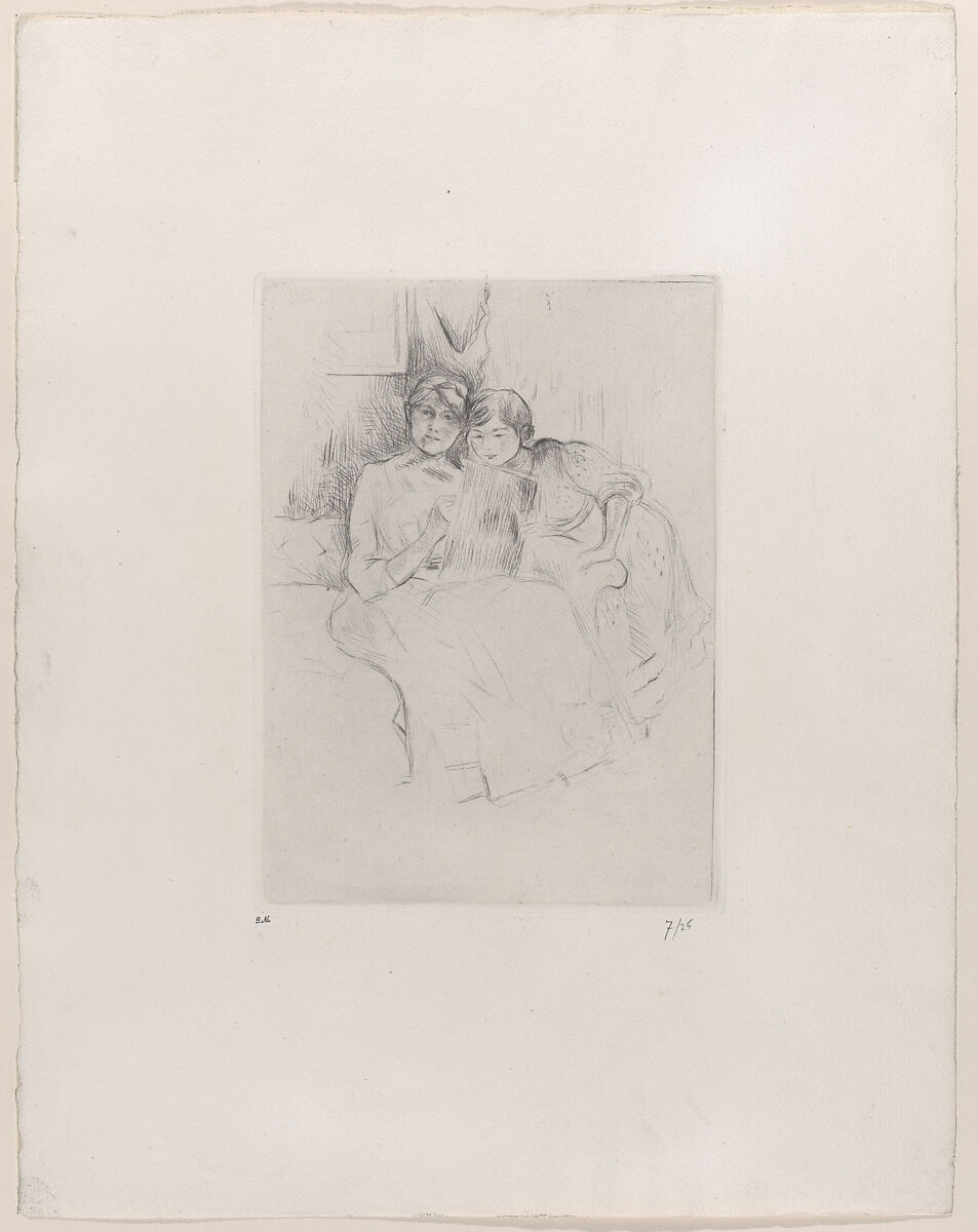 Morisot made only eight drypoints, among which this self-portrait is the most accomplished. She shows herself in the act of drawing her reflection while her daughter, Julie Manet, looks on over her shoulder. Over the course of her career, Morisot depicted Julie more than any other subject. Here, she reconciles her dual roles as mother and artist in one image. Her prints were never published in her lifetime. For the posthumous edition, Julie titled this work "The Drawing Lesson."