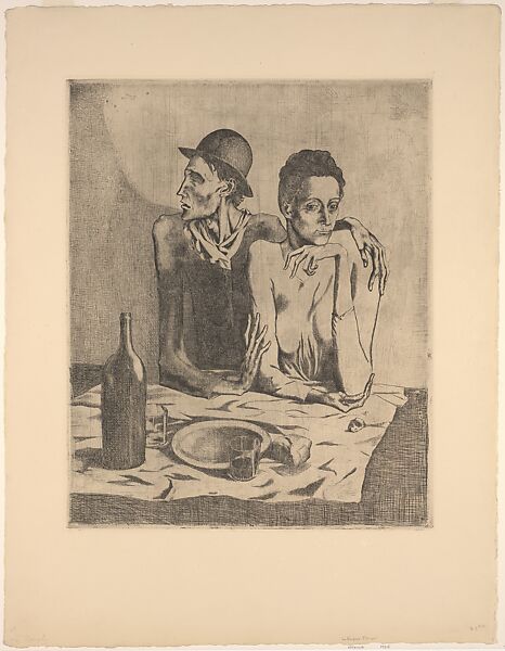 This iconic image marks the beginning of Picasso's prodigious career as a printmaker. The sense of despondency and isolation is typical of his work at this time. Executed in only two states, the etching possesses a remarkable confidence and skill that belies Picasso's lack of formal training in printmaking. He had received only rudimentary instruction from friend and fellow Spaniard Ricard Canals; previously, he had made just one other print, in 1899.