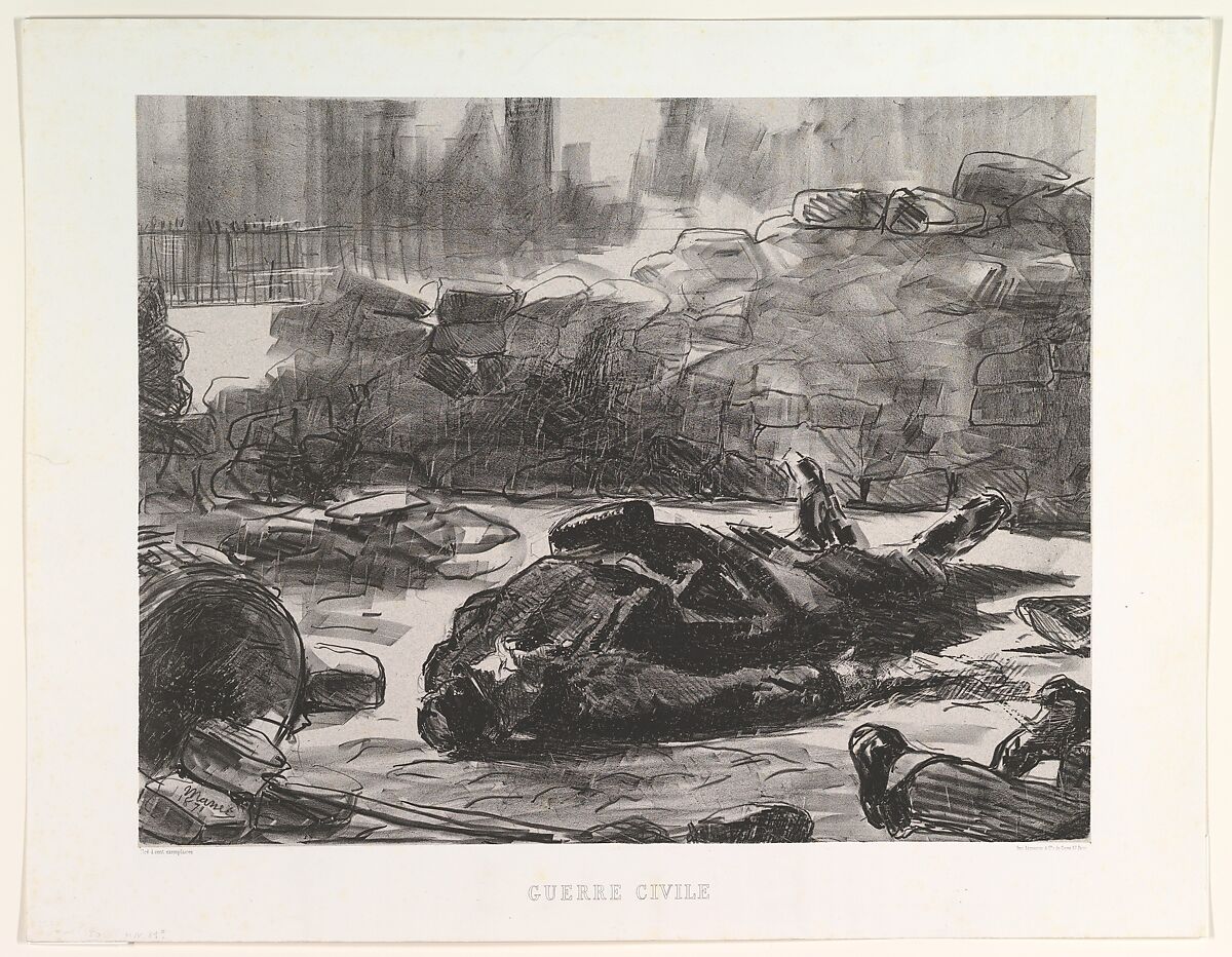 After serving in the National Guard during the Siege of Paris, Manet remained outside the city for most of the Commune but returned to witness the atrocities of its violent suppression in late May 1871. According to his friend Théodore Duret, he based this lithograph on a sketch made from life near the Madeleine Church, the site of one of the first massacres of Communards by Versailles government troops. The dead National Guardsman lying beside the barricade stands for one of many, while the pinstriped pant legs in the right corner refer to additional civilian casualties. Manet’s animated use of the lithographic medium, which included employing the side of the crayon for broad strokes, as well as scratching into the greasy black marks, suggests that the dust has barely settled on this scene.