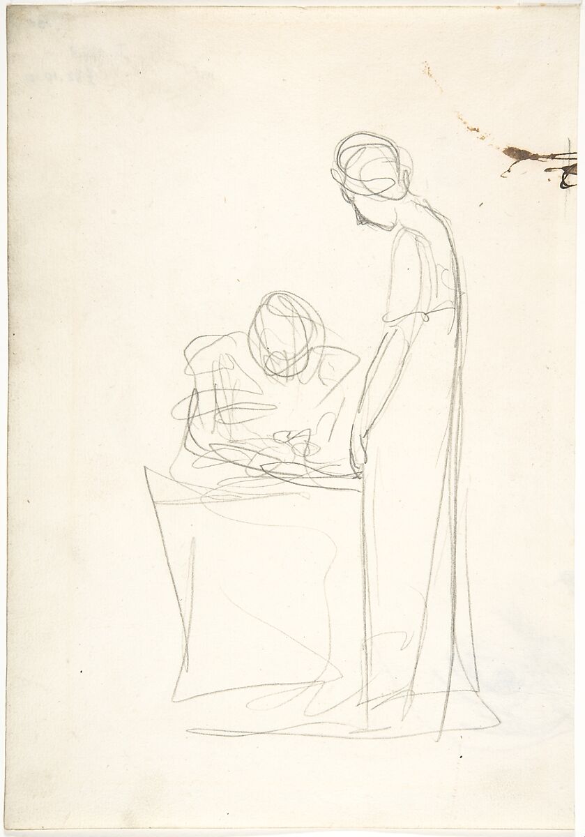 Long deft strokes of graphite are here applied trace the slim figure of a woman who bows her neck to watch a seated figure who rapidly writes or sews. The draftsmanship used to describe the observer suggests composure, and contrasts with the frenetic calligraphy Romney employed to describe her companion, and the sheet comes from a sketchbook used by the artist between 1775-78, first in Italy then London. The present drawing likely dates around 1777, after Romney's return to England.