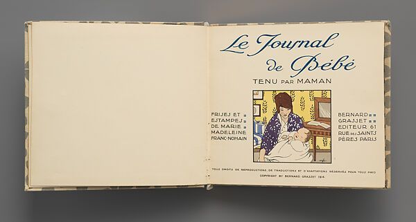 The developments in children’s illustration in England by artists such as Walter Crane and Kate Greenaway were greatly admired in France. Their stylistic influence is evident in the work of Franc-Nohain, who began her career as a magazine illustrator. This journal was the first book she fully designed. It contains sections to record important events and milestones in the life of a baby.