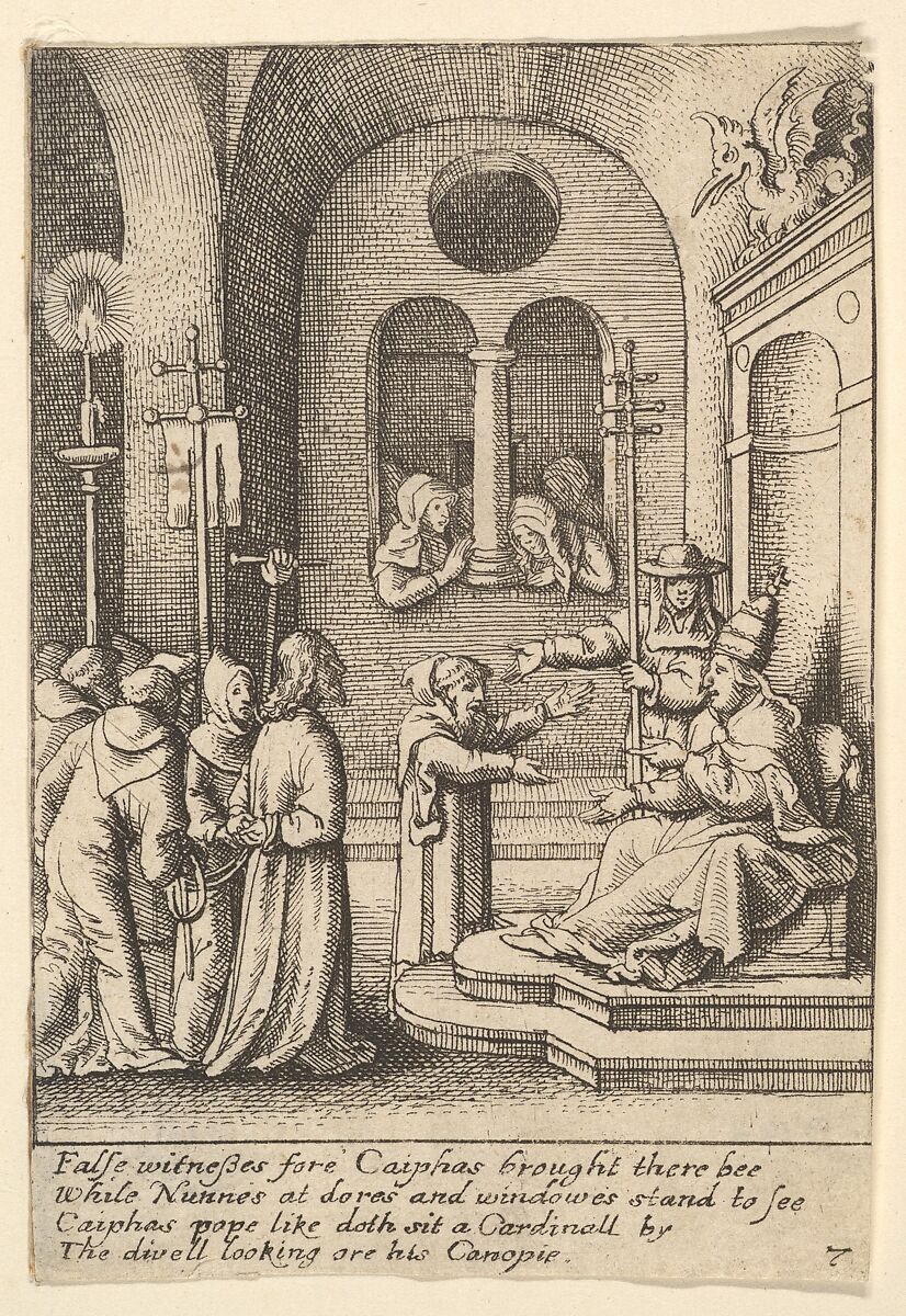 Caiaphus wears papal garb and sits on a throne surmounted by a dragon in a niche at the right. Christ, with hands bound, is brought to him from the left.