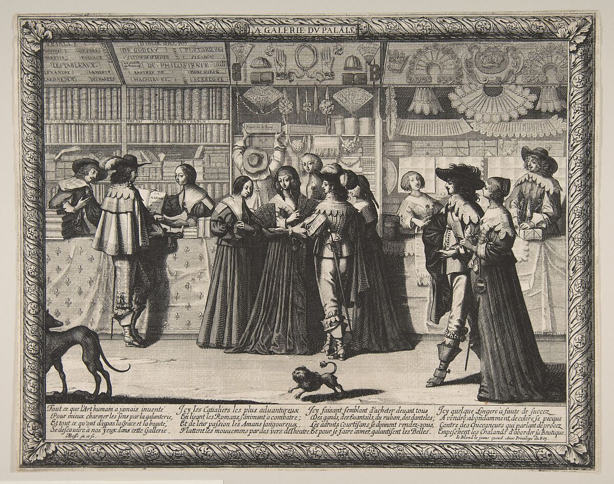 In his view of the gallery of the Palais de Justice, Bosse featured a stall selling women’s accessories between a bookseller and a lace merchant. Among the shoppers at the very center, a woman inspects two fans, while behind her a shopkeeper reaches up for a box labeled "Fans by Bosse." Indeed, the printmaker had published three semicircular fan designs around the time he etched this print.