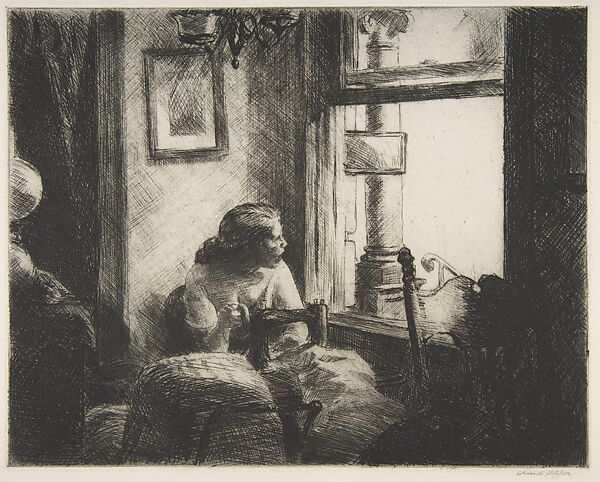 In a New York interior, a woman looks up from her sewing machine to gaze out an open window, the heat suggested by the loosened neck of her dress. Hopper had returned to New York from Paris in 1910 and took up etching when his paintings failed to find buyers, producing about 70 prints between 1915 and 1923. In addition to men and women experiencing the distinct fabric of his new home town, the artist evoked memories of France and explored rural and coastal landscapes in Maine and Massachusetts. After Hopper received two awards for his prints in 1923—the Logan Prize from the Chicago Society of Etchers and the W. A. Bryan Prize—he refocused his energies on painting, but often returned to subjects he had used etching to shape.