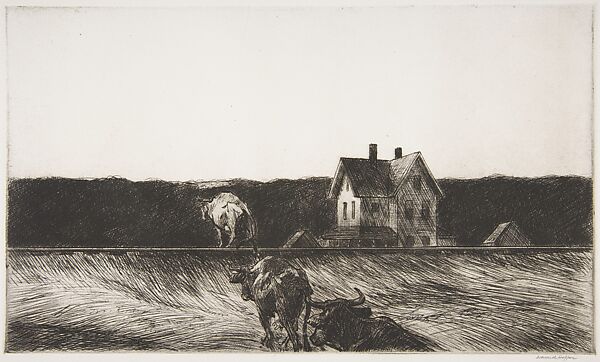 In this unconventional rural life, cows clamber over railroad tracks towards a wooden house and outbuildings. Hopper produced about 70 etchings between 1915 and 1923. He had returned to New York from Europe in 1910 and explored this new medium when his paintings failed to find buyers. In addition to landscapes inspired by summer visits to Maine and Massachusetts, his prints evoke memories of France, and show men and women experiencing the distinct urban character of New York. After Hopper received two awards for his prints in 1923—the Logan Prize from the Chicago Society of Etchers and the W. A. Bryan Prize—he refocused his energies on painting, often returning to subjects that he had used etching to shape.
