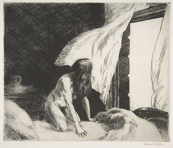 In this work, the viewer catches an unknown individual in the most private of moments. In an everyday scene that acquires drama and mystery in Hopper's hands, a naked woman kneels on the edge of a bed. Her face is veiled by her long hair as she turns her head toward the window in surprise or fear, reacting to the sudden movement of the curtain at the open window. Hopper has included very few details in the interior of the room, so that the scene remains universal in its emotional impact. His etching technique creates a sharp contrast between the darkness of the heavily crosshatched background and the untouched white paper of the space outside the window, and the area of the scene is so shallow that the viewer feels a physical closeness to the woman, as if present in the room with her.