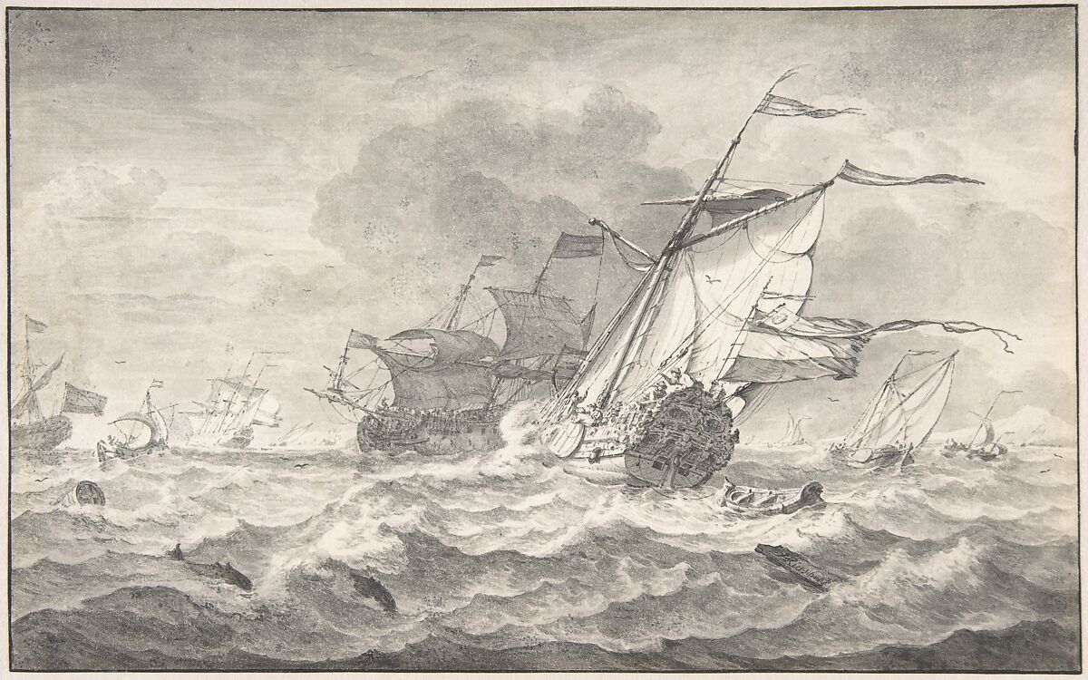 • Title: Merchant Ships and Smaller Sailing Boats in a Strong Breeze, Dolphins in the Waves