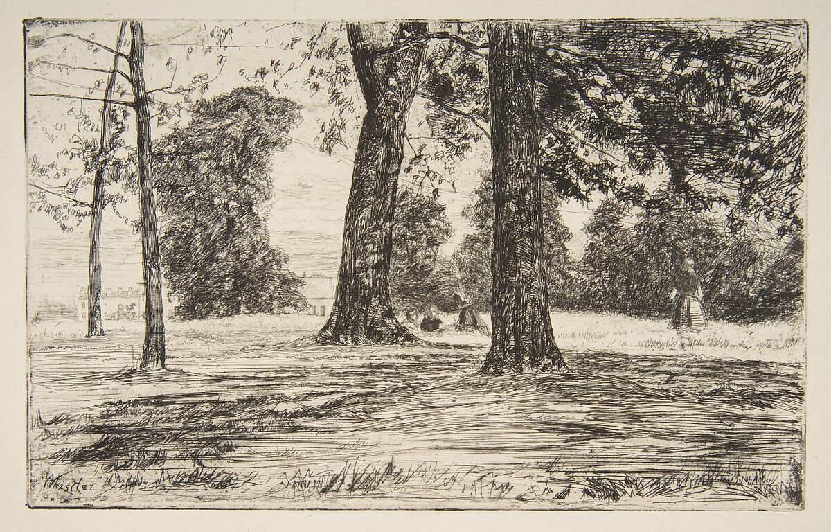 Whistler travelled down the Thames to find subject this subject of a shaded lawn at Greenwich, visiting the park with his etcher brother-in-law Seymour Haden. Both created prints that show a naval pensioner from the nearby Royal Hospital for Seamen relaxing on the grass (Whister's titled "Greenwich Pensioner" (17.3.27) and Haden's "Sub Tegmine" (Under the Canopy; 17.3.276). The Met has two other impressions of "Greenwich Park" (83.1.22, 17.21.71).