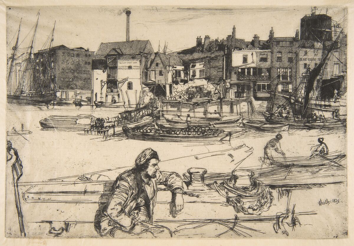 When he moved to London in 1859, Whistler lodged near the Thames in the docklands south of Tower Bridge and began to make etchings of the river. New visual modes are explored here, with cropped forms and distinct spatial zones recalling Japanese woodblock prints—a genre he began collecting in Paris. Borrowing an effect from photographs, he renders the distant warehouses in sharp focus but treats closer forms broadly. Made in 1859, this etching was not published until 1871 in A Series of Sixteen Etchings of Scenes on the Thames and Other Subjects (the "Thames Set"). That year, Whistler also reproduced it on the wall behind his mother in the now famous painting, Arrangement in Grey and Black (Musée d’Orsay, Paris).