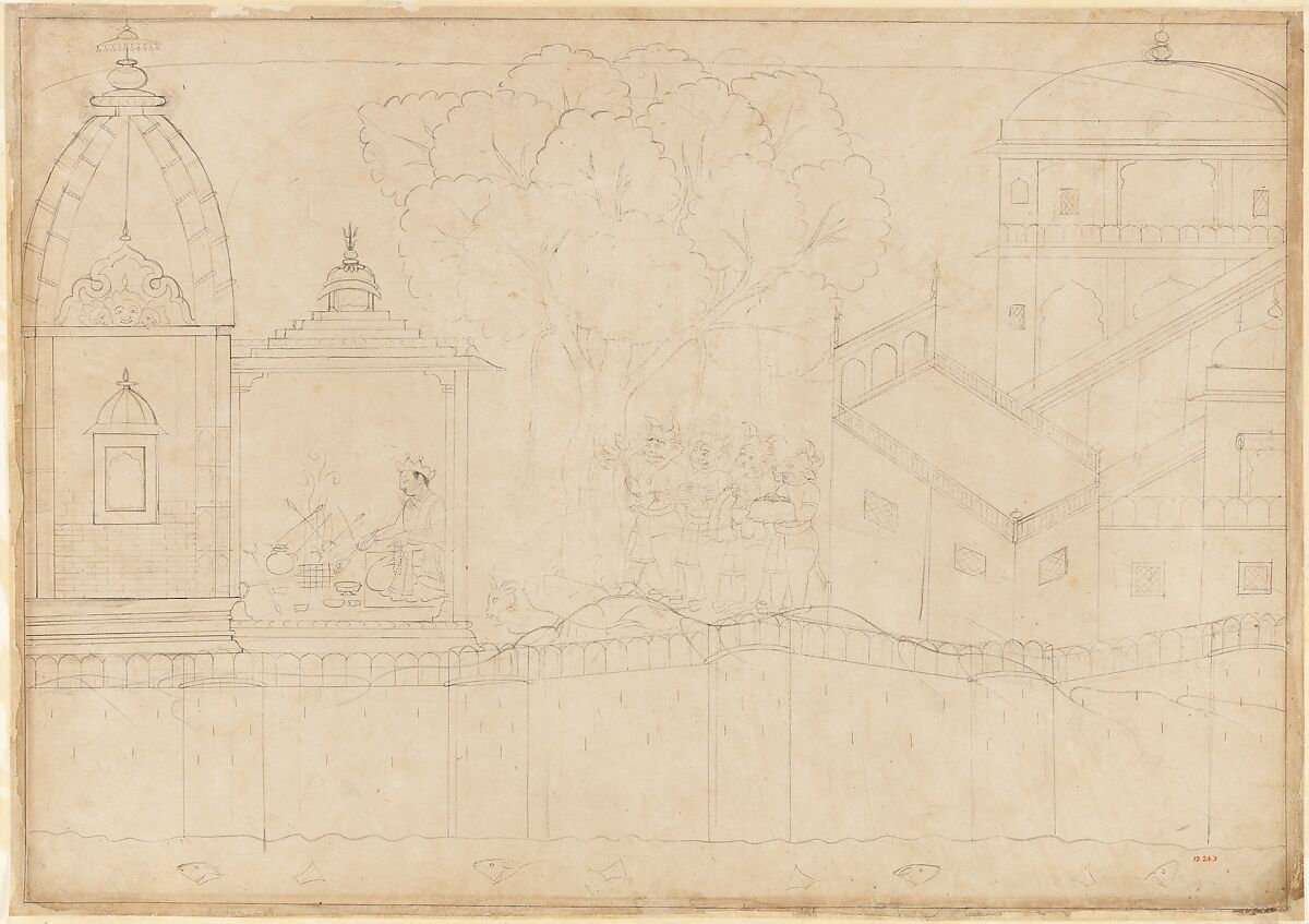 This preparatory drawing was for a painting intended for a Siege of Lanka series produced in the court studio at Guler (Rama Releases the Demon Spies Shuka and Sarana is a finished work from the series). Here, Ravana's son Indrajit, seated before a fire altar, makes an offering to the gods to secure the power to become invisible and fight his enemies from the air. Ravana's demons wait outside the temple holding offerings for the sacrifice; at their feet lays a decapitated goat, which Indrajit will offer to the god Agni. Following the success of this sacrifice, he attacked and overwhelmed Rama and Lakshmana, binding them with arrows (see Rama and Lakshmana Overwhelmed by Arrows). This drawing displays the skilled and subtle brushwork of the master artist Manaku and reveals his predilection for idiosyncratic solutions combined with a bold approach to composition.