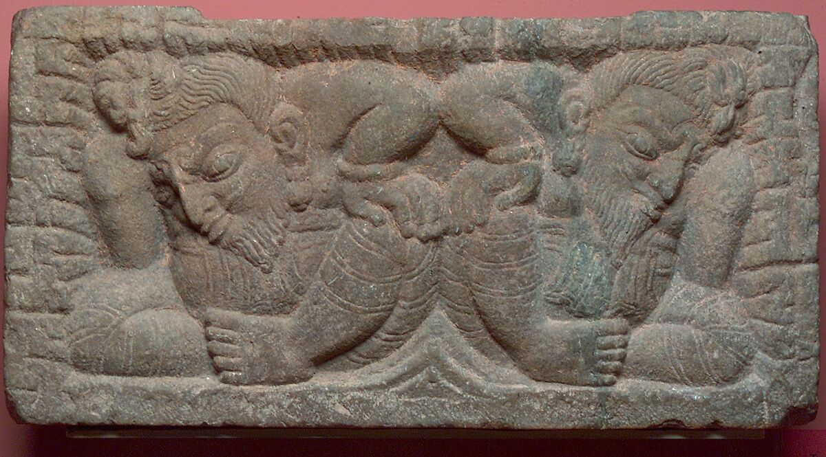 Two bearded yakshas crouch in a rocky landscape, marking the threshold between the revealed world and the subterranean underworld, of which they are the gatekeepers and guardians. Yakshas—here with deeply furrowed brows, long braids of hair piled in a topknot, and large globular earrings and bracelets—are typically represented as obese dwarfs and are renowned for their mischievous and malevolent nature if not appeased. This panel likely functioned as a caryatid supporting a pillar of a Licchavi-period religious structure, a shrine, or pavilion (mandapa).