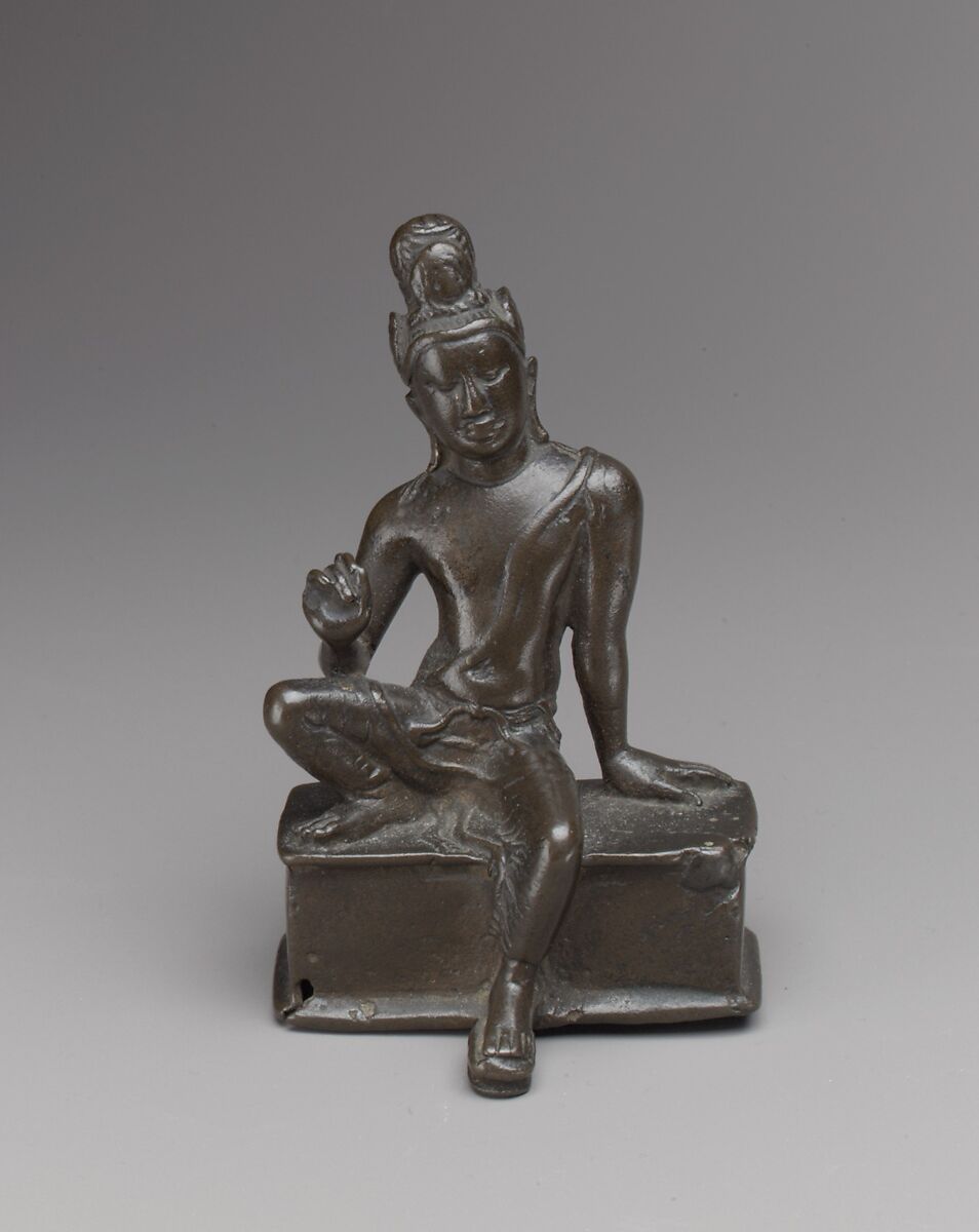 This small bronze, representing Avalokiteshvara, the Bodhisattva of Infinite Compassion, shares the physical proportions, sensuous plasticity, and exquisite modeling that characterize the sculpture of southern India in the seventh century. The deity's narrow face and elongated nose, however, attest to the work's Sinhalese origins.
