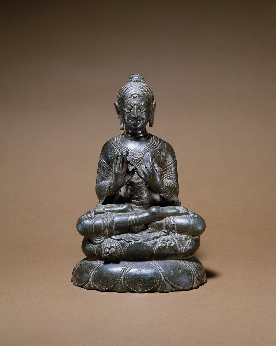 This Buddha, with his legs folded in a full yogic posture and his hands gesturing preaching, invokes the first sermon at Sarnath. The complex treatment of the monastic robes, most notably their pleated ends, is evidence of an unidentified monastic workshop, probably located in Kashmir or the Swat Valley. The treatment of the hair curls is unconventional, as is the extreme stylization of the eyes and eyebrow. Silver inlay marks the eyes and auspicious forehead mark (urna).