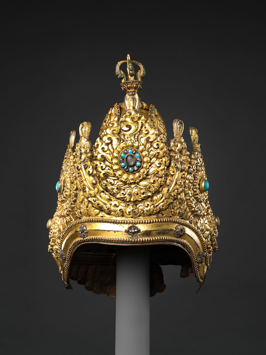 Elaborate crowns such as this example were worn by the hereditary Vajracarya Buddhist priests of Nepal, who occupy the highest rank in the Nepalese Buddhist community. Vajracarya is both a caste and a family name, and the designation entitles it holders to perform reserved priestly functions, analogous to the privileges held by Brahmans in Hinduism. This crown is dominated by five diadem plaques and surmounted by a half-vajra. The dated inscription records that it was commissioned by two named devotees, to be worn on the occasion of the consecration of newly installed icons of Chakrasamvara and Heruka. The consecrations were performed by srī Bekhāsi deva Vajrācārya of Naka Bahicā of OBāhā, "on Thursday, the 10th of the dark half of Bhādra, during the Pusyā naksatra and the Siddha yoga" (1717). The inscription concludes by listing the punishments incurred by those who covet the crown as well as the merits earned by its donors, extolling: "[May it be] auspicious for all time."