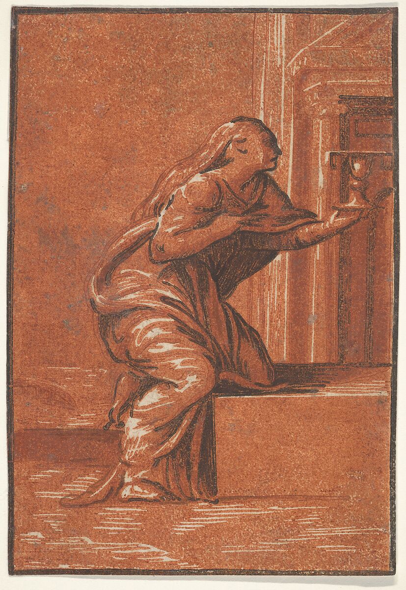 - Title: Female personification of Faith who kneels raising a chalice in her left hand, after Parmigianino