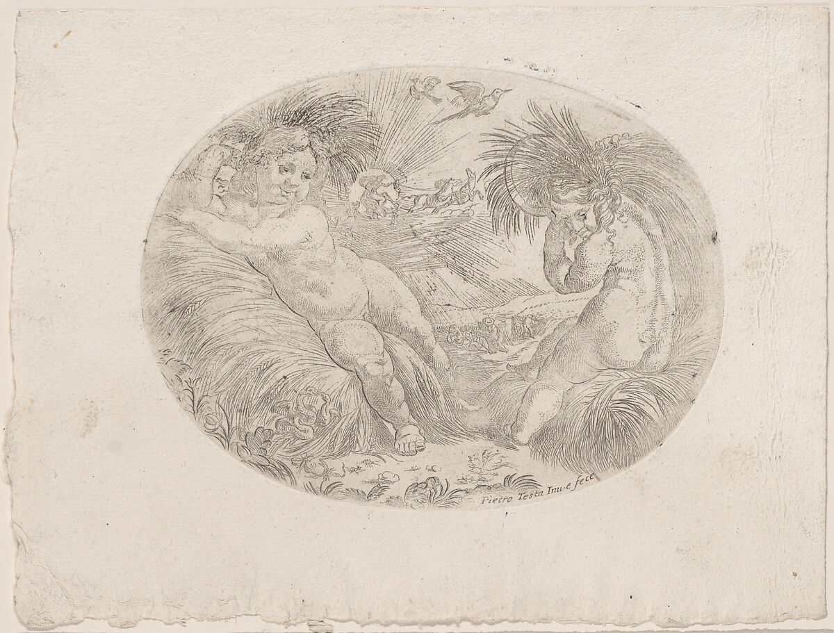 - Title: Putto at left reclining on sheaves of wheat, another at right carrying a sheave over his shoulder, an allegory of the seasons (Summer), an oval composition