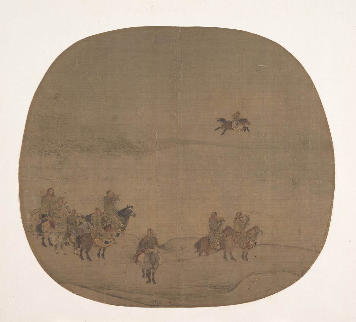 Chen Zhuzhong specialized in depicting nomadic horsemen and their lives on the steppes. This exquisite fan painting, in which the hairstyles, costumes, and saddle trappings of the Khitan people are faithfully rendered, may be dated stylistically to Chen's period of activity or somewhat later. The horseman galloping away in pursuit of his quarry recalls a similar figure in Eighteen Songs of a Nomad Flute.