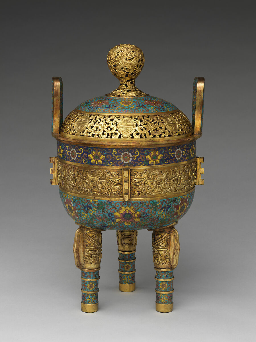 Emperor Qianlong’s interest in antiquarianism influenced the design of decorative artworks in the court. This incense burner follows the shape of a bronze tripod ding vessel. The colorful floral scrolls in cloisonné enamel are enhanced by the gilded relief band at the center, which is decorated with a pattern inspired by the animal-mask design ubiquitous in ancient imagery.