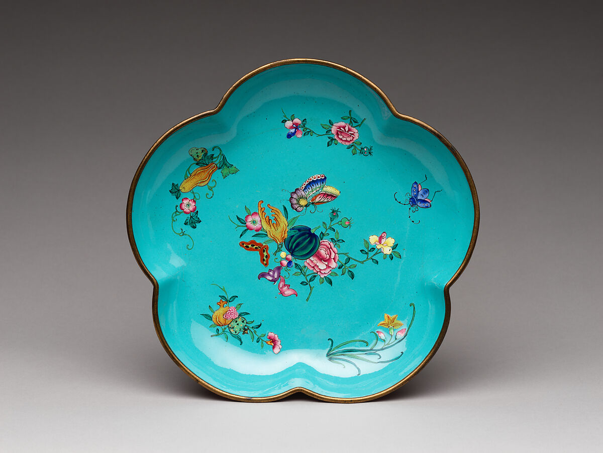 - 清中期 銅胎畫琺瑯“萬延年製”款花蝶紋葵口盤
