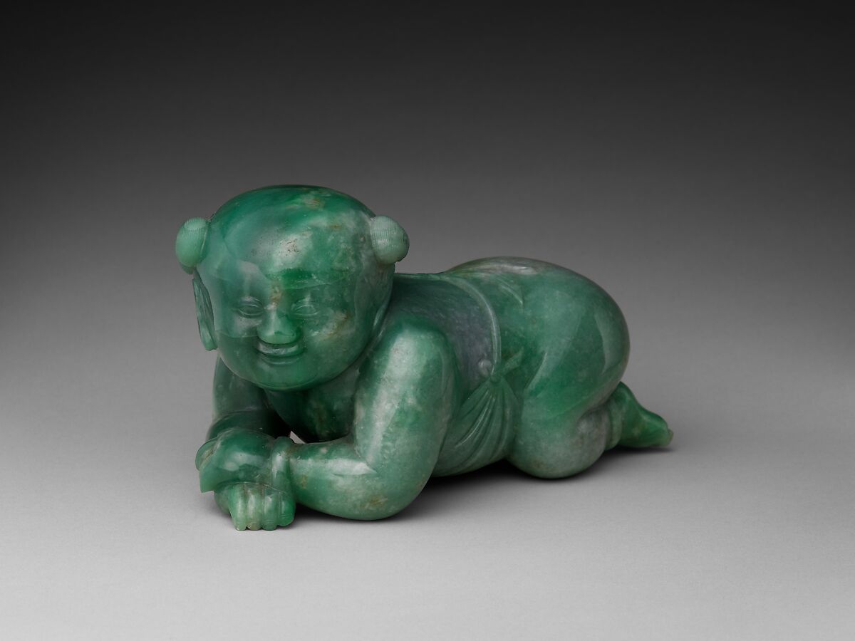 Jadeite was introduced into China from Myanmar, probably in the seventeenth century, and became a favored material at the eighteenth-century Qing court for its intense green color, high translucency, and vitreous luster. This remarkable sculpture of a crouching boy is modeled after the ceramic pillows of the same shape that were produced at the famed kilns of the Song period (960–1279). It not only illustrates the elegant taste of the Qing court but also denotes the increased access to the prized material. The boy, a common motif in Chinese art, expresses the wish for multiple children to carry on the family line.