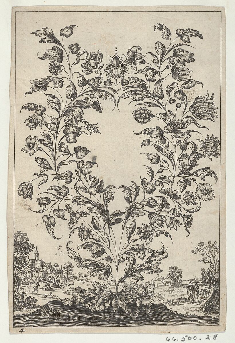 Decorative floral arrangement in an oval shape growing from the soil at center. At right, a strolling couple with dogs. At left, falconers on horseback in front of a townscape.