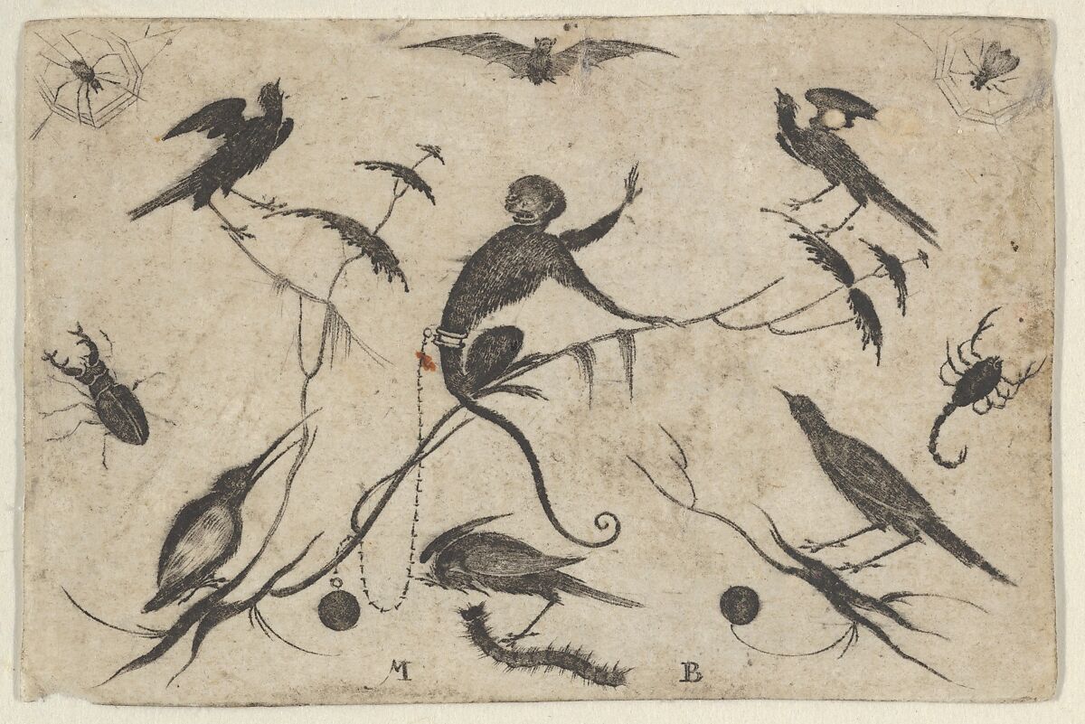 Ornamental panel with a monkey facing to the right on a limb, surrounded by birds. At edges of the plate are various insects, including a spider, beetle and fly. At top center, a bat.