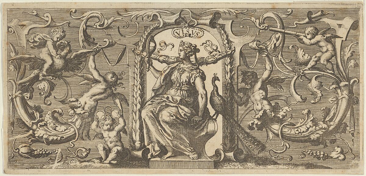 Horizontal panel with the personification of Visus (Sight) shown as a female figure looking at herself in a mirror, under an arch formed from strapwork and garland at center. Around the arch, inhabited scrollwork and putti, including a putto riding an eagle at upper left, one with glasses at lower left, and another with a spyglass at upper right. The series, consisting of a title and five plates with the senses personified by female figures, is titled 'Quinque sensuum descriptio, in eo picturae genere quod (Grottesche) vocant Itali' (Description of the Five Senses in that kind of painting that the Italians call grotesque). This set belongs to the 3rd edition, published in London by Robert Walton after 1646 (ca. 1655). An inscription on the title plate (45.101.1) credits Walton as the publisher ('SOULD BY RO: WALTON), but there are visible traces of the name and address of the publisher of previous editions.