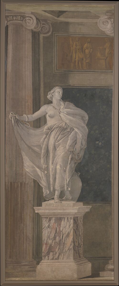 These illusionistic depictions of allegorical sculptures from the Palazzo Valle Marchesini Sala in Vicenza were part of an immersive fresco cycle completed around 1760 and detached around 1900. Incised lines (still visible in raking light) helped to guide Tiepolo as he painted quickly before the walls’ wet plaster surface dried. Tiepolo consulted a specialist in perspective, Mengozzi, to ensure that the foreshortened depictions of architecture and sculpture aligned when one stood at the center of the room, evidence of just how site-specific such decorative programs could be.