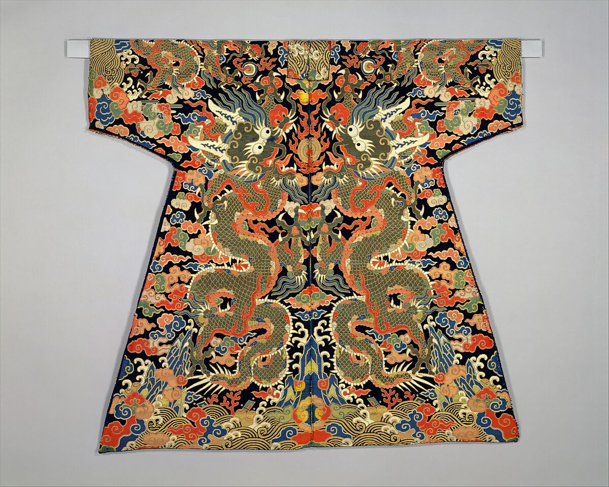 This rare piece illustrates the early stage of the design of dragon robes during the Qing dynasty. The size of the dragon in comparison to that of the robe, as well as its power and ferociousness, continues the design style of the Ming dynasty (1368–1644).