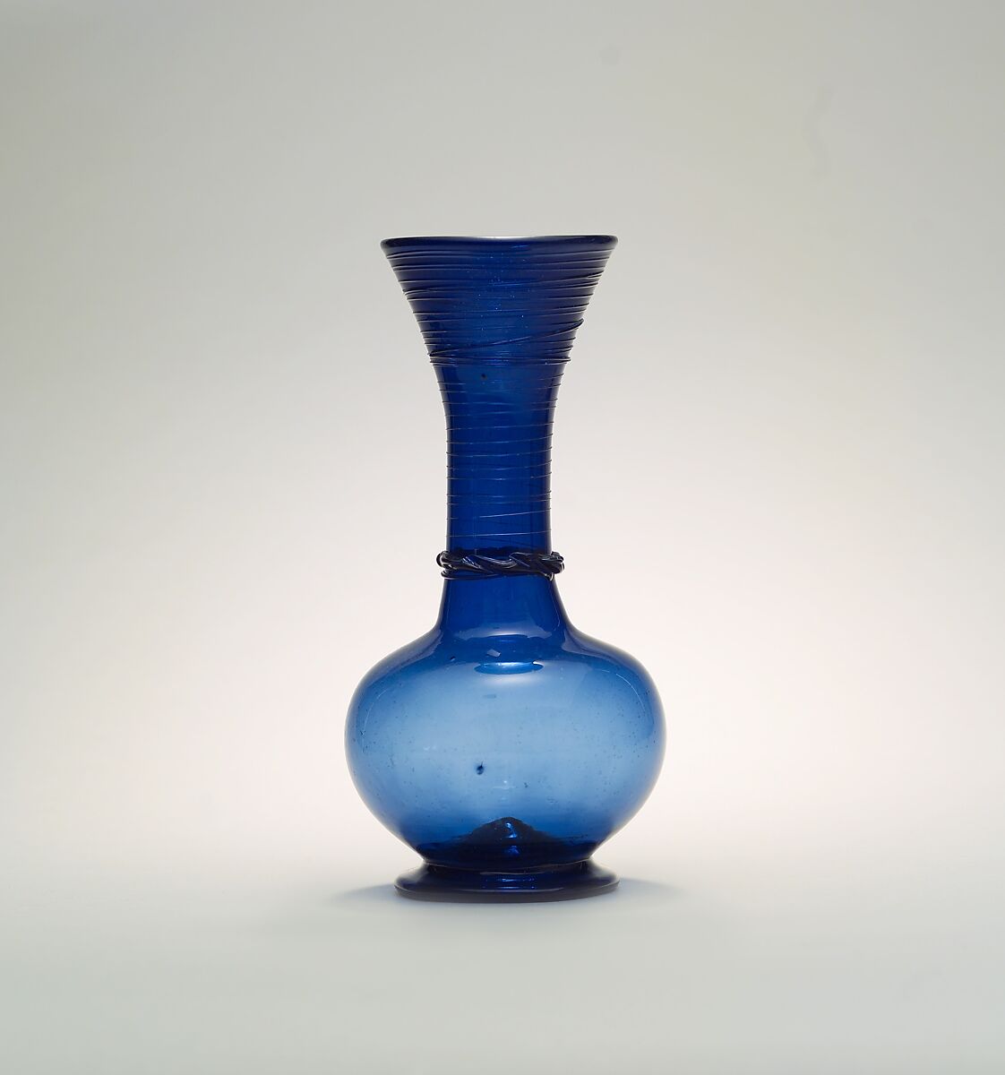 These types of wares–with a flared mouth and bulbous body– were produced in vivid blues and greens, illustrating the range of colors employed by glassmakers in the eighteenth and nineteenth centuries. This bottle may have been used to decant or store wine, or perhaps as a base of a water pipe. Such vessels were admired for their graceful shapes and often were decoratively displayed within niches of private and public buildings in Tehran, Isfahan, and Shiraz.