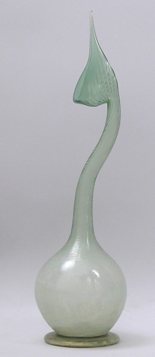 The distinct tear-shaped opening at the top of this bottle was carefully tooled while the glass was still molten, and flows into a thin, curvilinear neck, before expanding to a globular body resting on a low foot. The visual resemblance to the curved and attenuated neck of a swan has inspired the name of these types of bottles, but according to folklore, these bottles were used as "containers for tears," (ashkdan) meant to collect the sorrows of wives separated from their husbands.