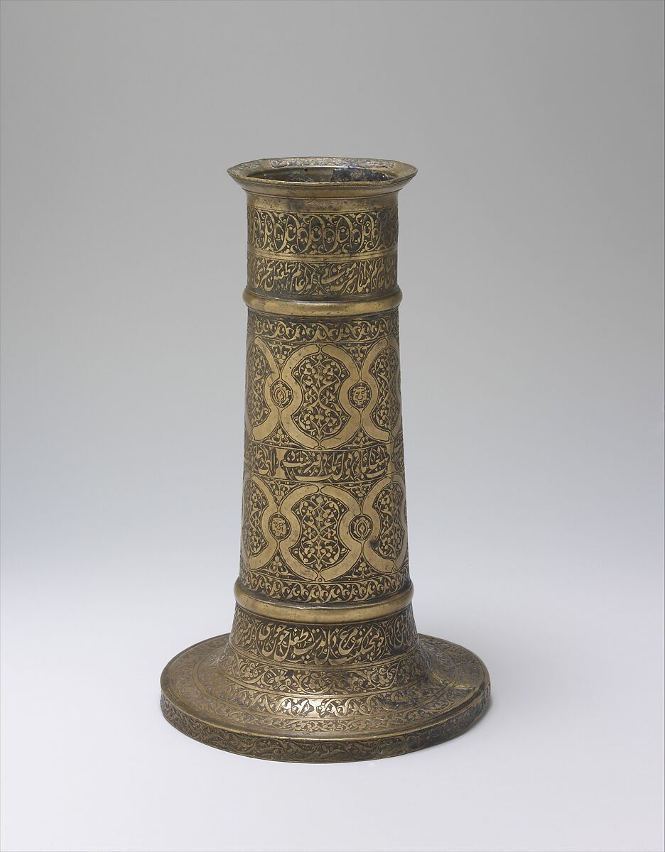The verses inscribed around this lamp stand embody spiritual metaphors comparing the beloved to a candle and the lover to a moth attracted to its light. The verse by an unidentified poet encircling the middle portion of the stand reads: