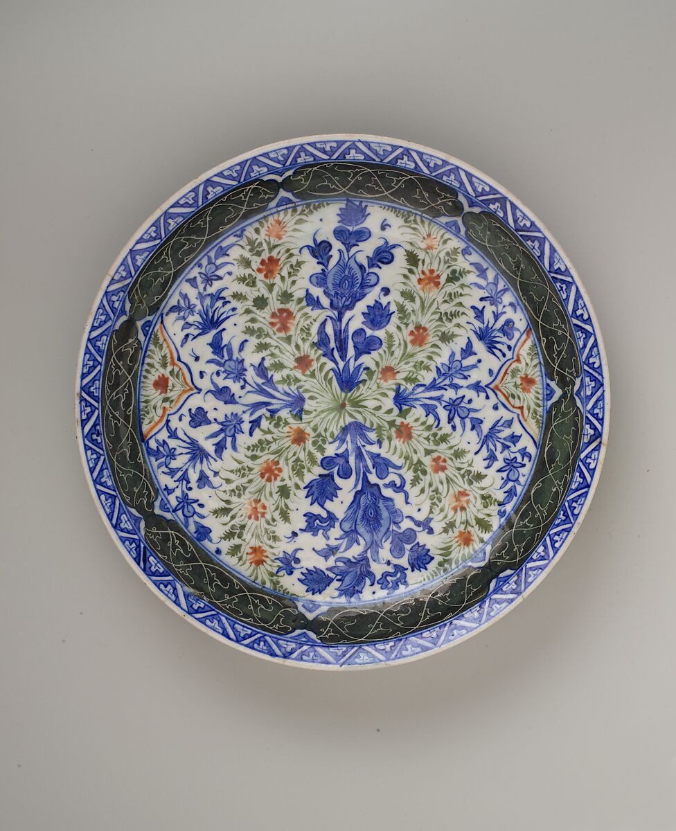 This dish is part of a group of polychrome ceramics which were produced in Kirman, Iran. The fortunes of this city in southeastern Iran rose under Shah ‘Abbas I (r.1587–1629) when a number of major monuments were commissioned. To decorate the new buildings and cater to the needs of new patrons, many artisans, including skilled potters, moved to Kirman.