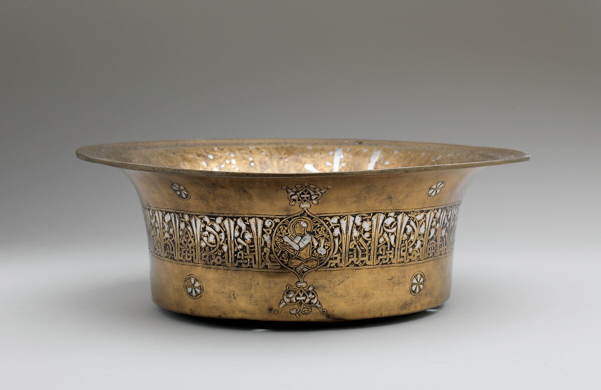 The bottom of this basin depicts the sun surrounded by all twelve signs on the zodiac and the seven planets of medieval belief. The titles of an unknown noble are arranged around the rim. This basin, with a matching ewer, may have been used for ablutions.