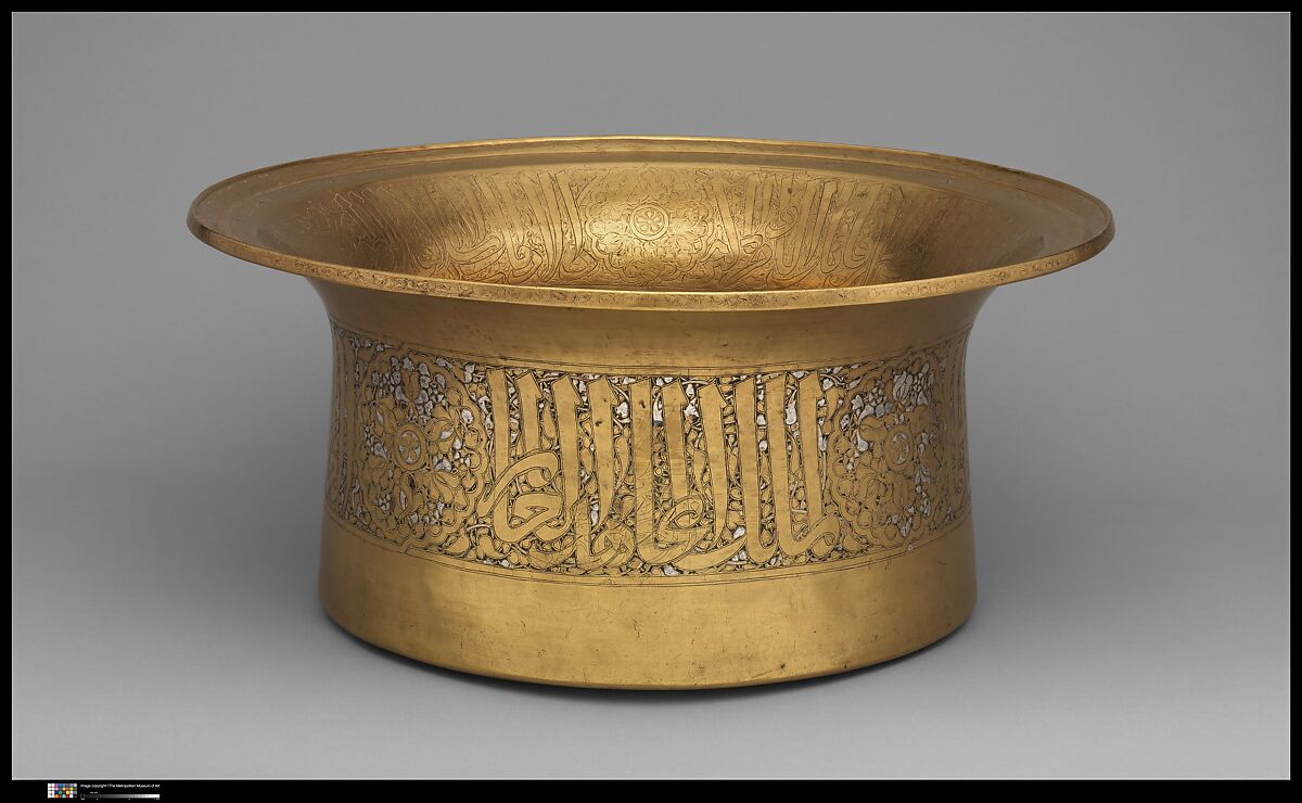 Although commissioned for a Rasulid sultan of Yemen, this basin reflects prevailing tastes of early fourteenth century Cairo and was clearly produced there or in Damascus, where comparable pieces were created. Bold inscriptions on the wall and rim constitute the central decorative theme, punctuated by medallions featuring lotus blossoms and the Rasulid emblem, a five‑petaled rosette.