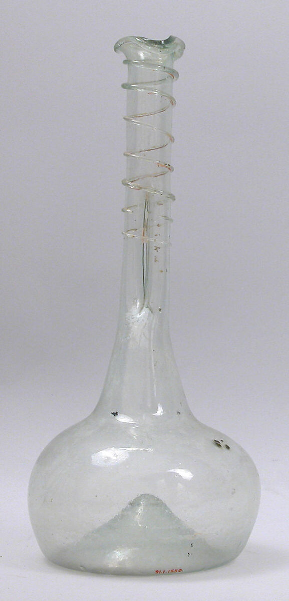 The deep inversion at base of the bottle has been left by the pontil, or rod that was used to facilitate handling during production and the application of decorative techniques.