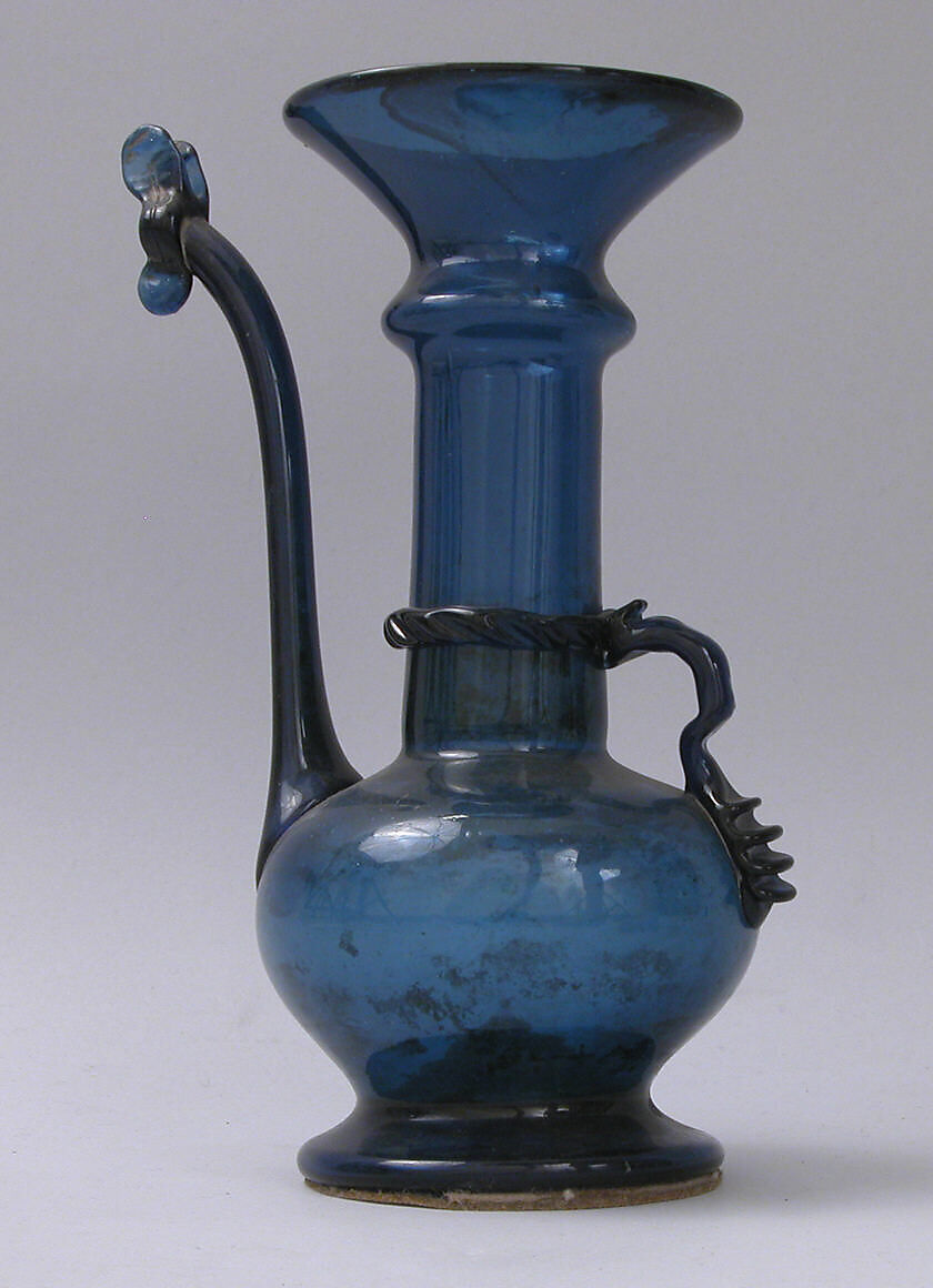These types of wares–with a flared mouth and bulbous body– were produced in vivid blues and greens, illustrating the range of colors employed by glassmakers in the 18th and 19th centuries. These vessels were admired for their graceful shapes and often decoratively displayed within niches of private and public buildings in Tehran, Isfahan, and Shiraz. The end of the spout is decorated with an applied 'butterfly' in the same color of deep blue, and the dainty handle suggests the object may have been more decorative than functional.