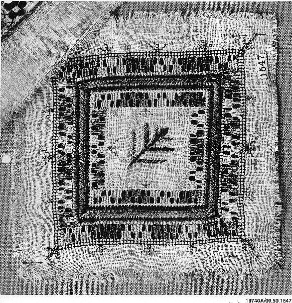 - Medium: Cotton, silk, and metal wrapped thread; plain weave, embroidered