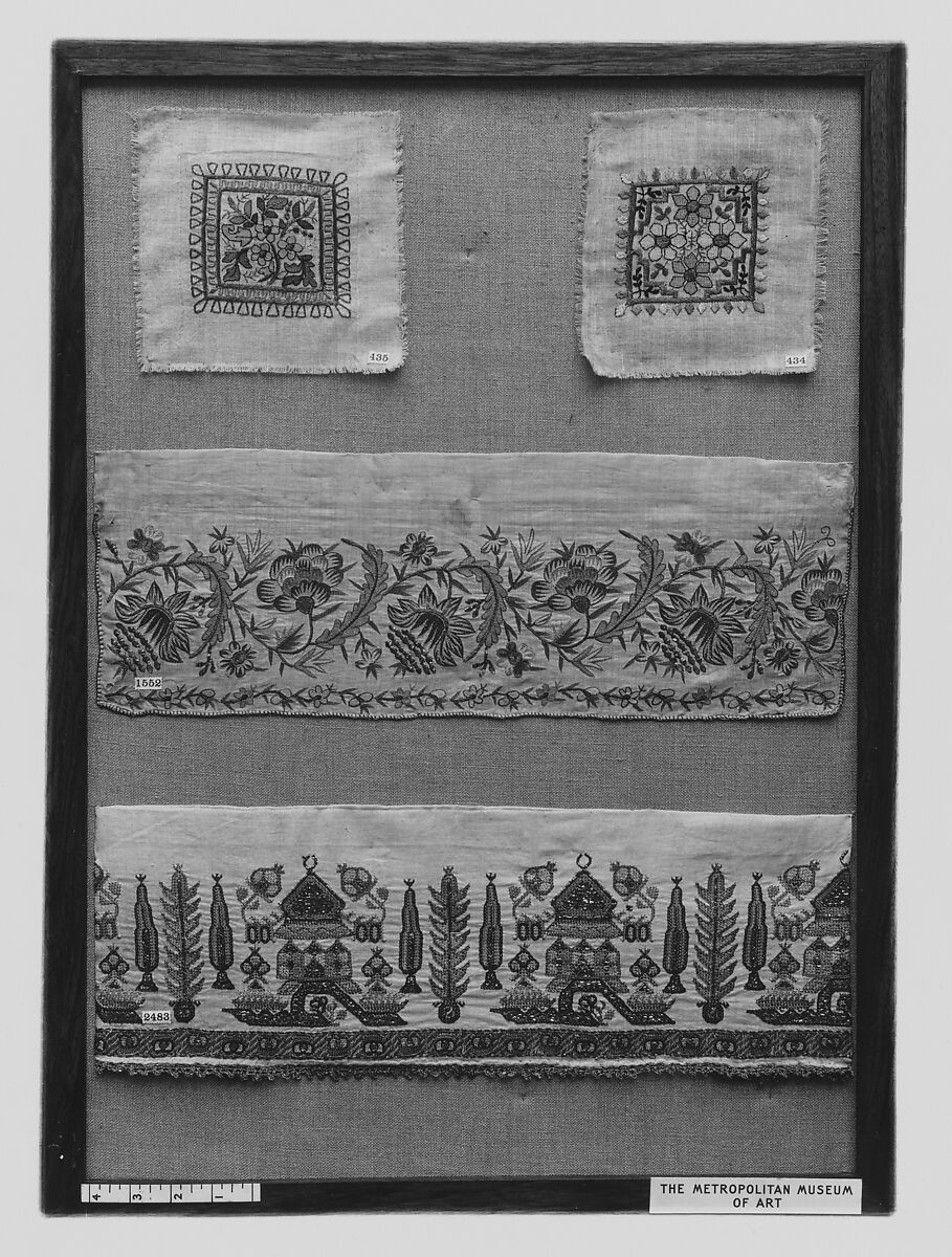 - Medium: Linen, silk, metal wrapped thread; plain weave, embroidered